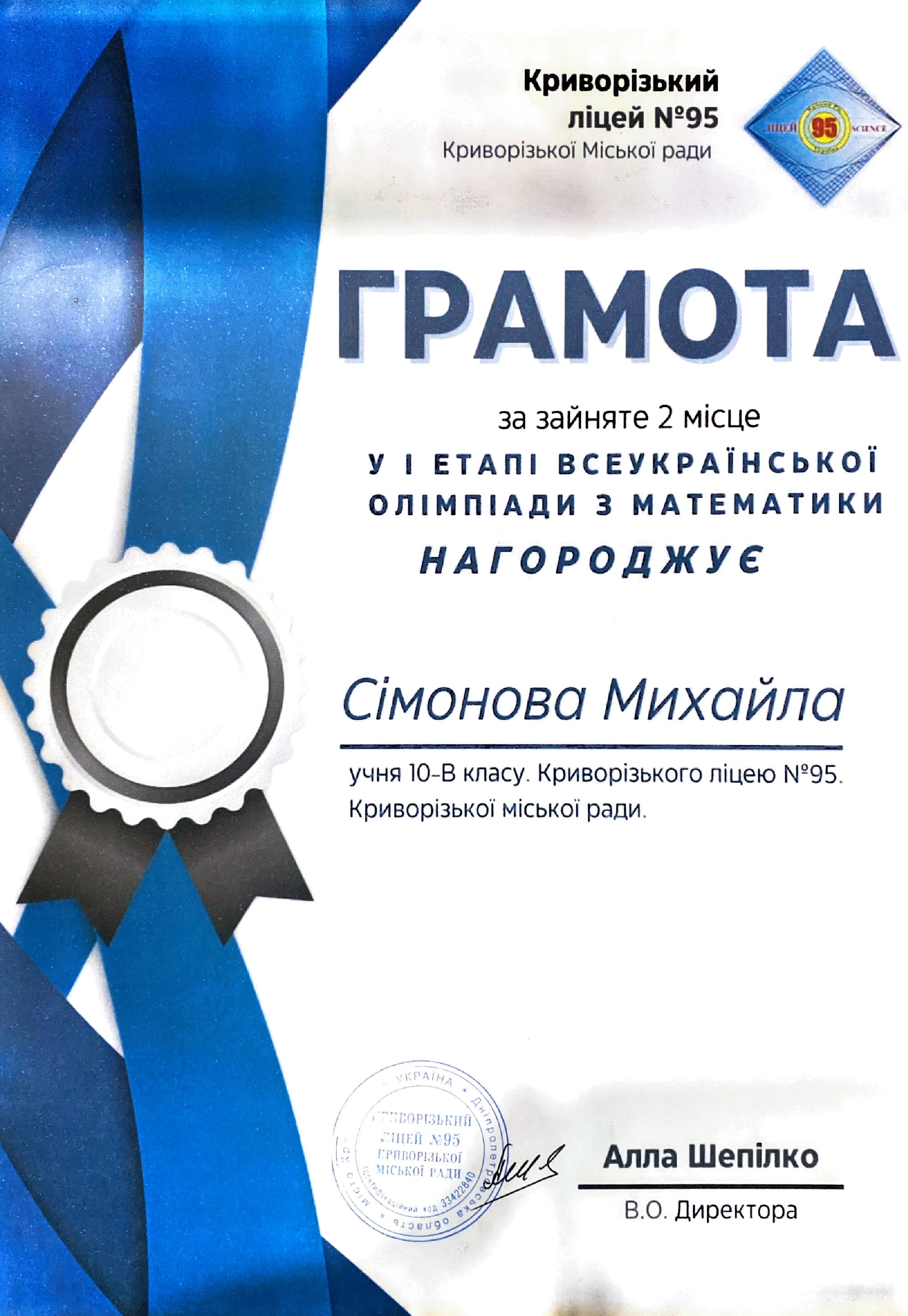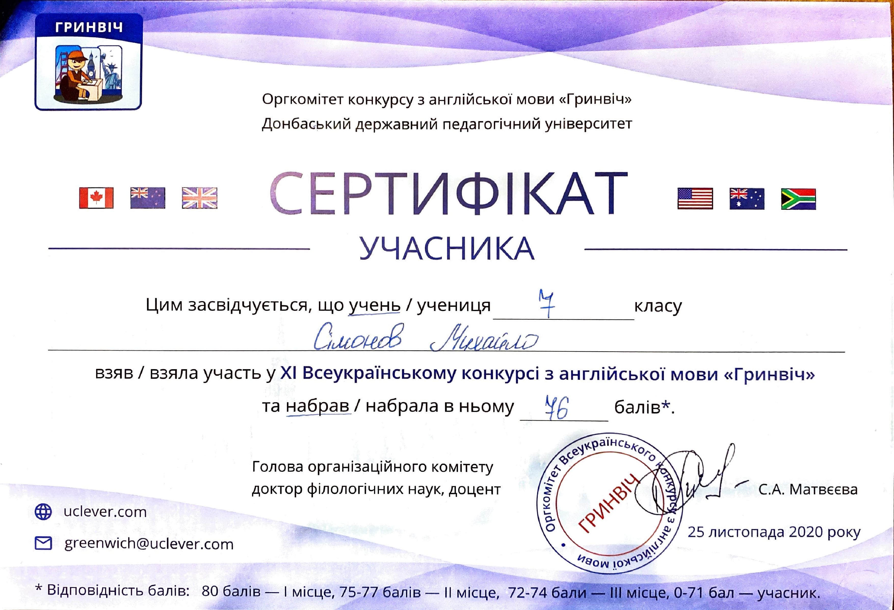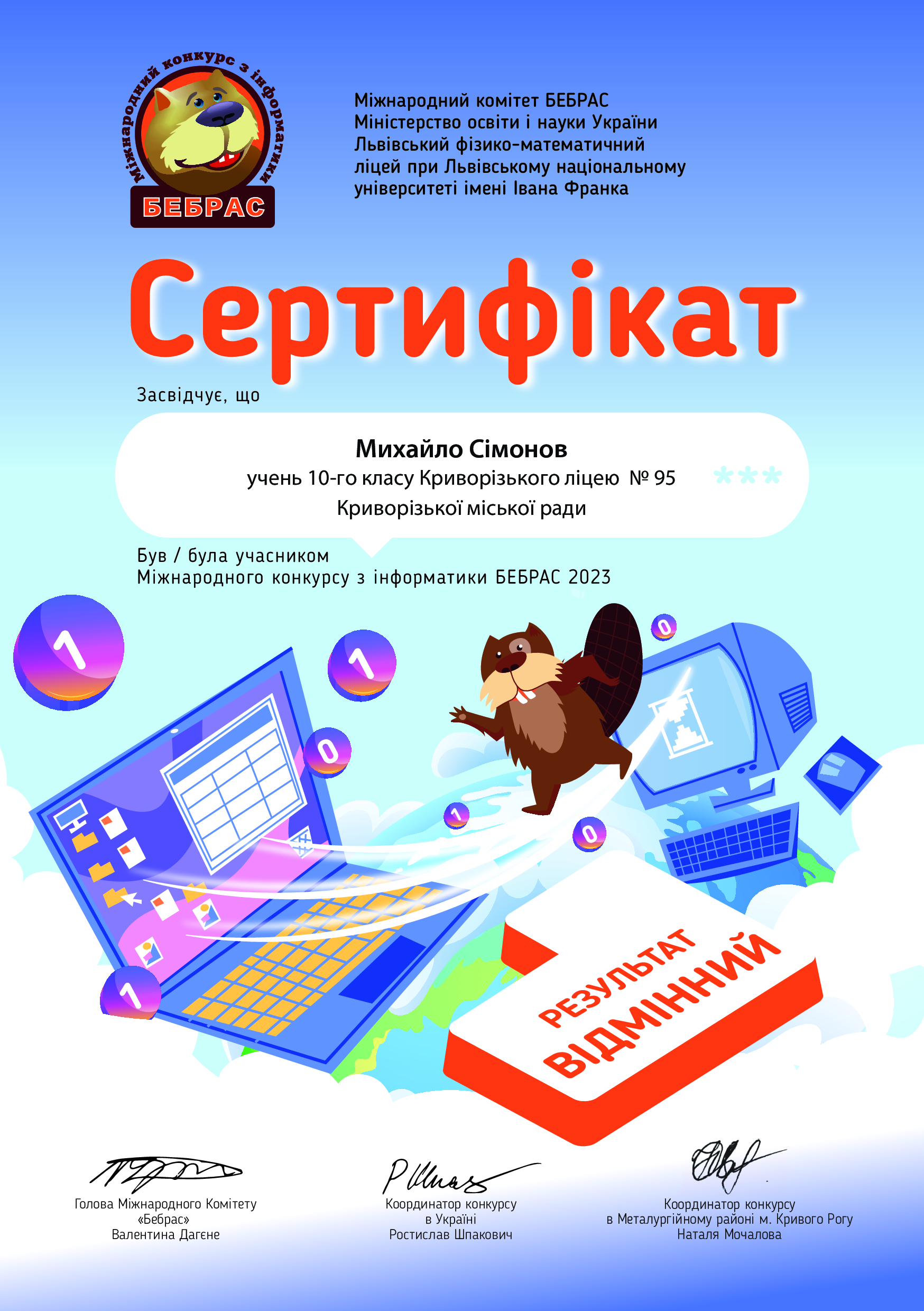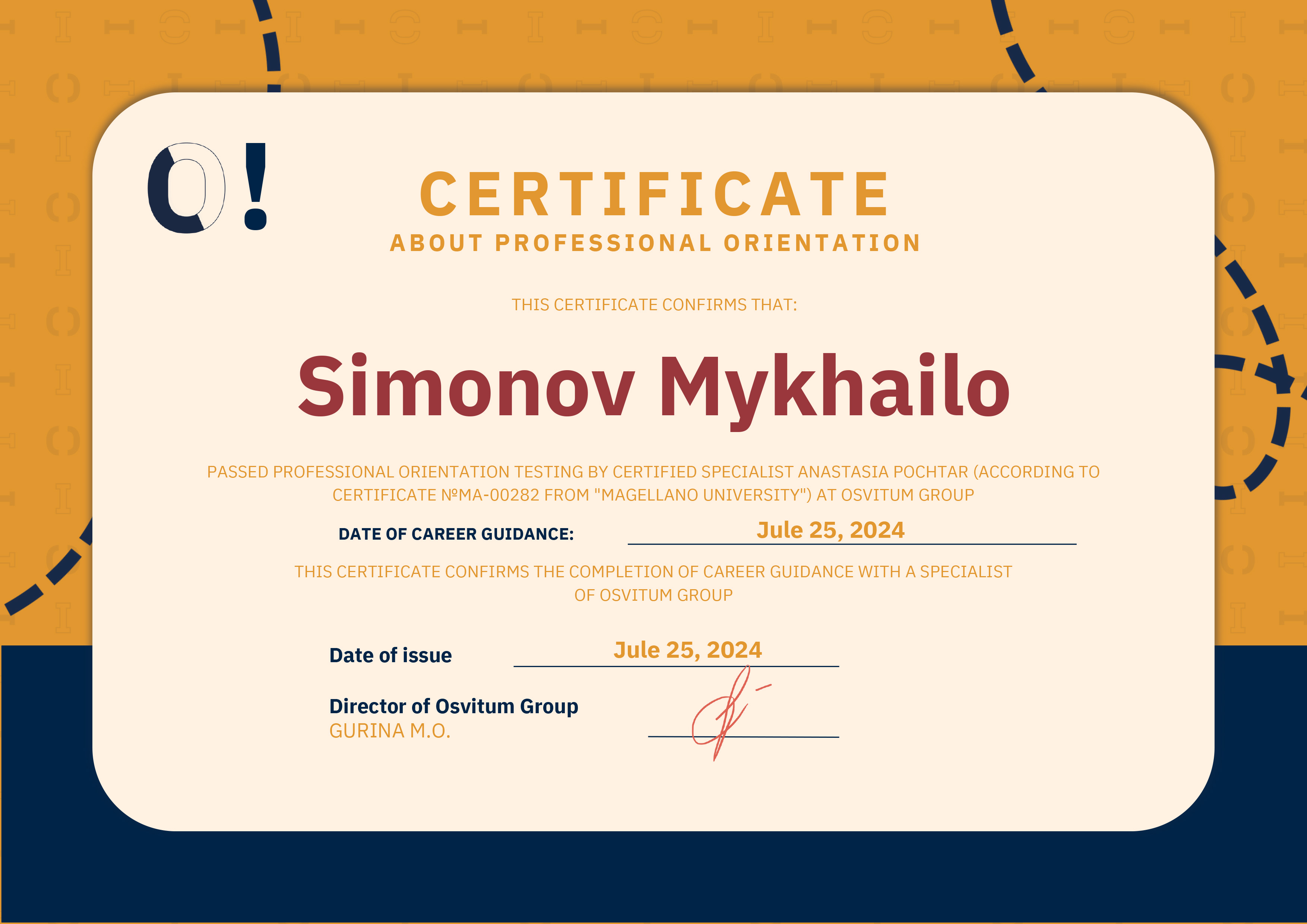 В липні 2024 року пройшов професійний тест «Magellano Університет» від італійської компанії «Giunti Psychometrics», розробника цієї методики, визнаної в Європі та сертифікованої в Україні. Отримавши сертифікат, я переконався, що мій вибір напрямків ІТ, інженерії, робототехніки та бізнесу є абсолютно правильним. Результати тесту підтвердили мої інтереси та схильності саме до цих галузей, що дає впевненість у майбутньому професійному розвитку та успішному кар'єрному шляху.
