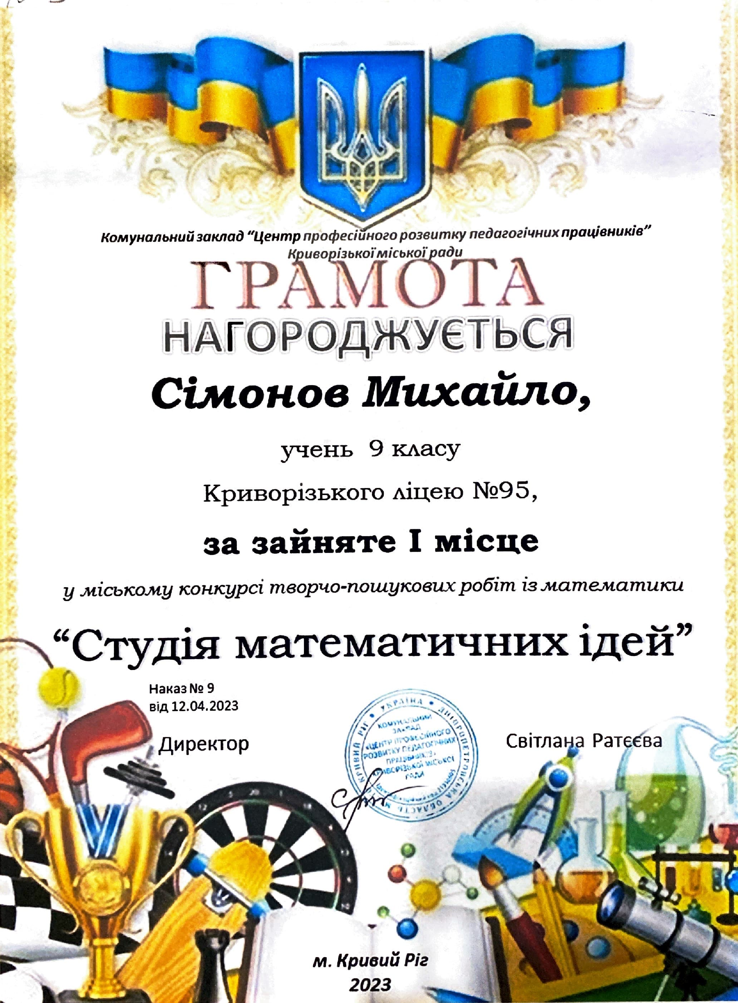 Мій професійний інтерес охоплює техніко-механічну, науково-технічну та економіко-адміністративну сфери. Завдяки моєму абстрактному мисленню та сильним математичним здібностям, я прагну розвивати свої навички в робототехніці, IT, інженерії або бізнесі. Маючи ефективні методи і стратегії навчання, а також хороший самоконтроль під час навчання, я зосереджений на досягненні високих результатів.