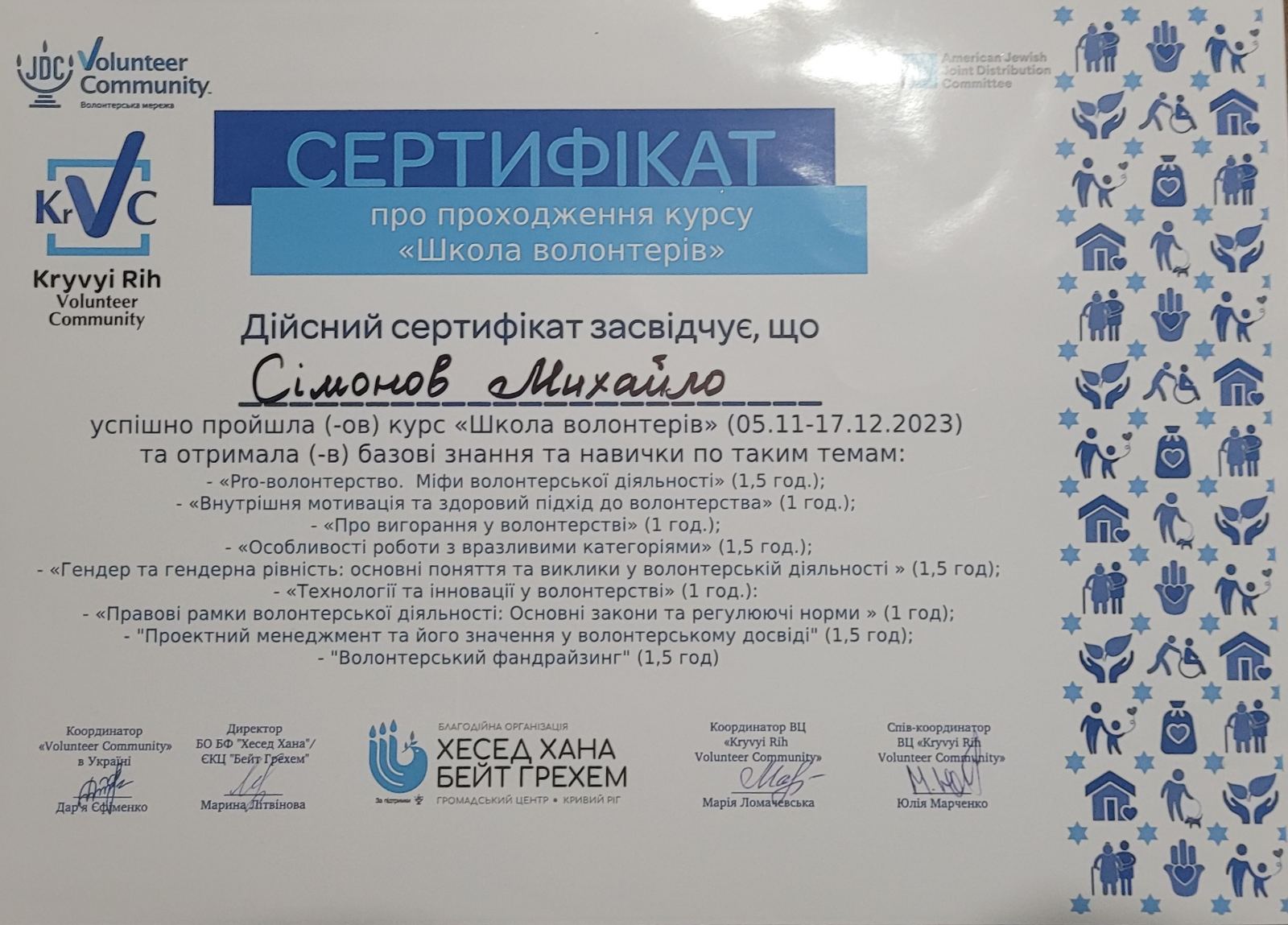 Отримав сертифікат за проходження курсу “Школа Волонтерів” - (2023)